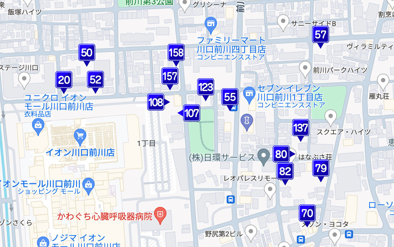 | 82 | 前川1-24-27 | 舗装 | 12,000円 | 無 | 満 | ー | 普 | 無 |